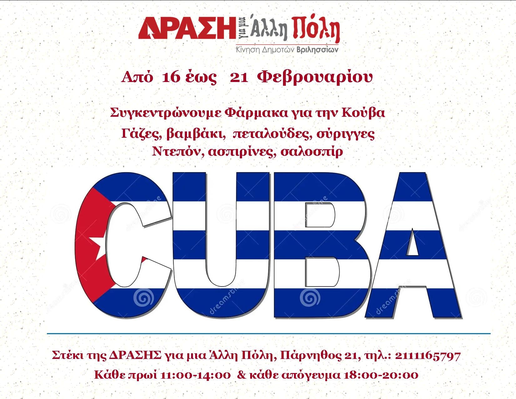 Το νέο στέκι της «Δράσης», Πάρνηθος 21 Βριλήσσια τηλ. 211-116-5797. H δωρεάν δανειστική βιβλιοθήκη και ταινιοθήκη λειτουργεί κάθε Δευτέρα 12:00-2:00μμ, Τρίτη, Τετάρτη και Πέμπτη 6:00-8:00μμ.