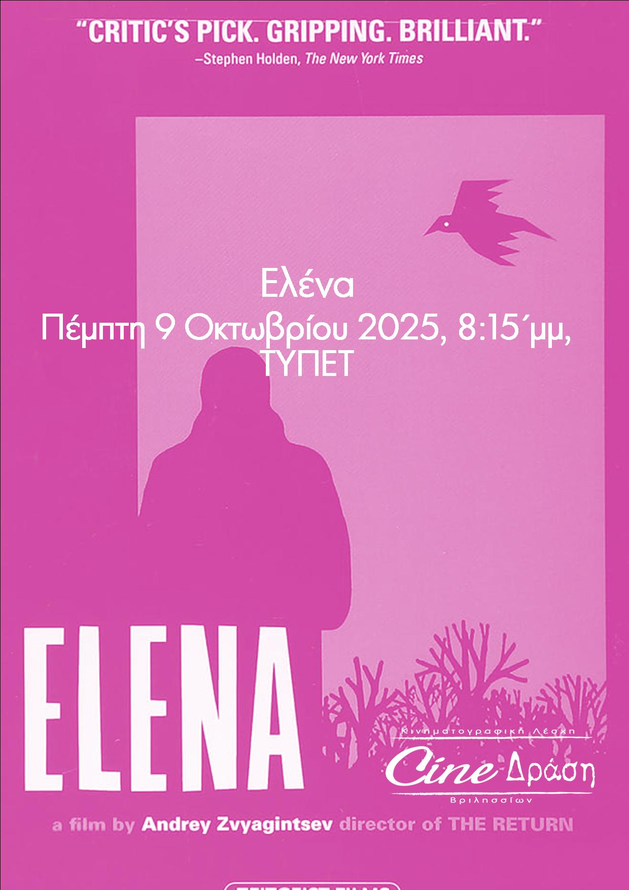 To Cine Δράση συνεχίζει τις προβολές του, την Πέμπτη 9 Οκτωβρίου 2025 στις 8:15΄ στο ΤΥΠΕΤ με την ταινία «Έλενα» (2011) του Andrey Zvyagintsev. Η τρίτη συναρπαστική ταινία του ταλαντούχου Ρώσου δημιουργού είναι ένα ψυχολογικό δράμα που εμβαθύνοντας σε πτυχές των οικογενειακών δεσμών ζωγραφίζει το πορτρέτο μιας κοινωνίας που κάθε άλλο παρά ευτυχεί, σε όποιο κοινωνικό επίπεδο και να βρίσκεται. Και παρόλο που ο ίδιος αναφέρει συχνά, μιλώντας για το φιλμ, ότι αφορά προσωπικά διλήμματα και μετάνοια η έμφαση δίνεται στην απόσταση που χωρίζει δύο ανθρώπους, δύο οικογένειες, δύο κόσμους που τους ορίζει η καχυποψία, η ψυχρότητα και η απαξίωση. Πράγματα συνηθισμένα στην κοινωνική καθημερινότητα που προδίδουν στην «Ελένα» οικουμενικότητα κάνοντας την άκρως ενδιαφέρουσα και συναρπαστική.
